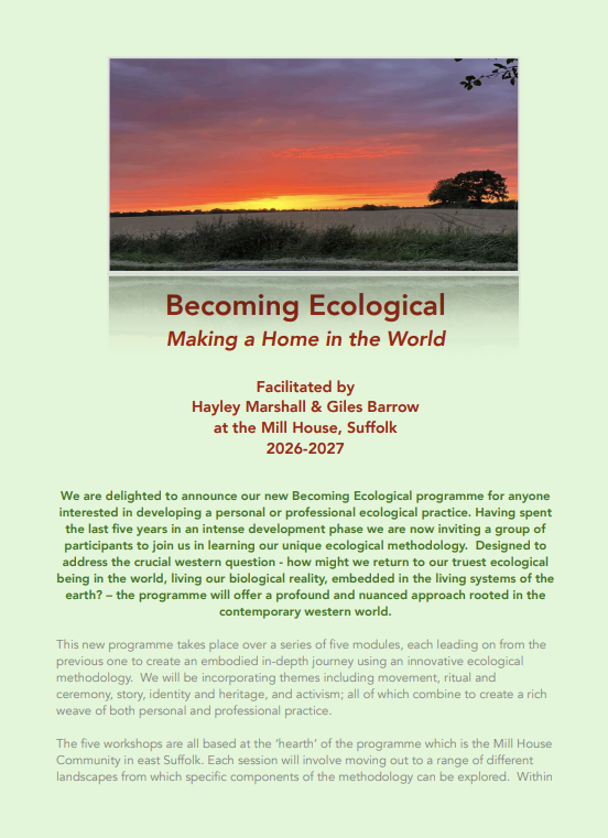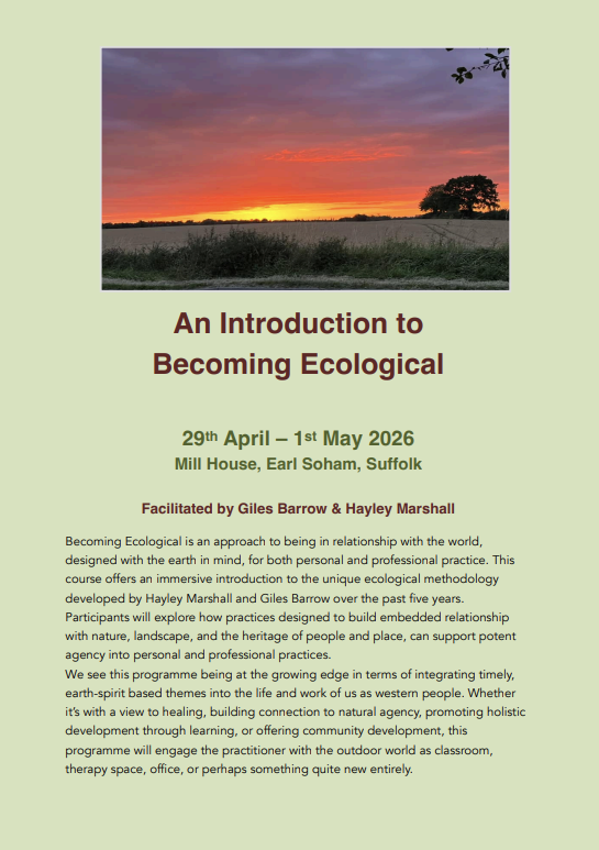 Ecological training and workshops for therapists, educators and coaches to work outdoors, based at Mill House in Earl Soham, Suffolk
